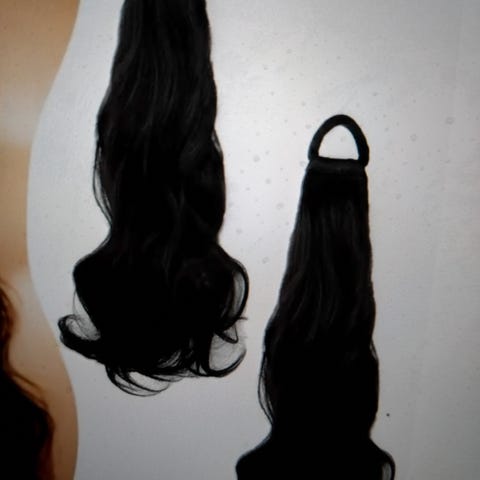 Naiset hiukset, joissa on ruskea ja musta väri. Hiukset ovat kiharaiset ja keskipitkiä sopivat erilaisiin käyttötarkoituksiin.