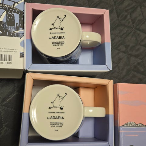 Uudet Muuminpäivä 2021 - mukit pakkauksissaan. Ovh. taisi olla 29.90e plus pk niin että ostohinnalla menevät. Kulkeutuvat Joensuuhun.