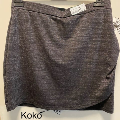Ruskeansävyinen hame, polven yläpuolelle ulottuva, koko L, kevyt vuori, joka näkyy kivasti alta. Epäsymmetrinen helma. Kannattaa katsoa myös muut ilmoitukseni ja ostaa samalla, niin säästää postikuluissa.