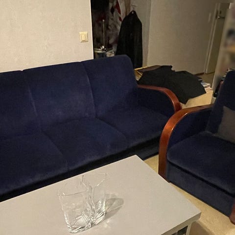 Sohva, kaksi nojatuolia ja sohvapöytä