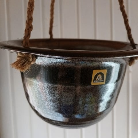Hyväkuntoinen Kermansaven savi amppeli. Heinä- sarjaa. Korkeus 16cm ja halkaisija 17cm. Nouto tai postitus.