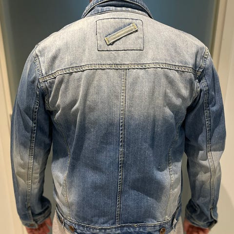 Vanha, pientä kulumaa saanut farkkutakki. Veikkaisin kokoa S - korkeintaan M.