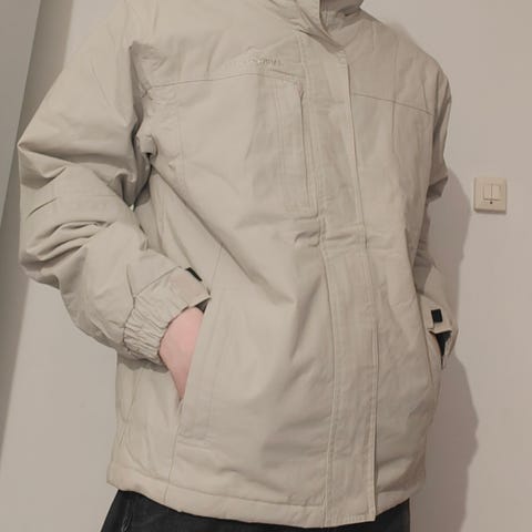 Takaa helmasta on irronnut alkuperäinen painonappi, mutta tilalle on ommeltu vähän samaa sävyä ja kokoa oleva tavallinen nappi.
