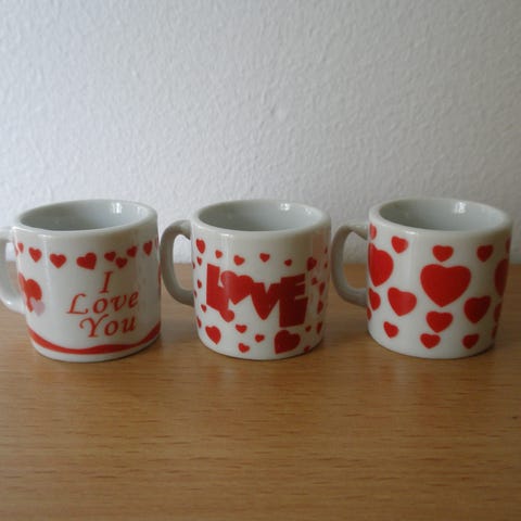 Myydään kaksi miniatyyri kuppia. Isomman halkaisija 3,5 cm ja korkeus 2,5 cm ja pienemmän halkaisija 2 cm ja korkeus 1,5 cm. Hinta kummaltakin yhteensä 3€.