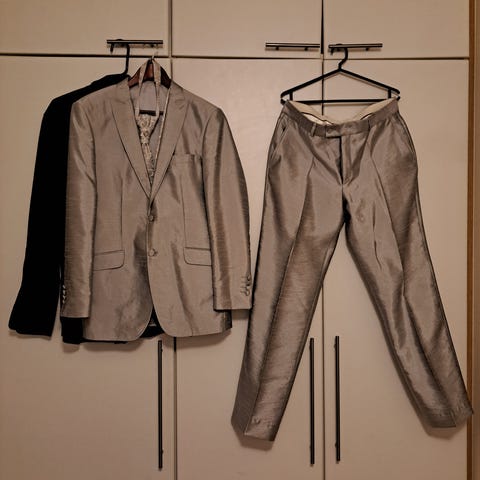 Takki on kokoa 52. Liivi ja housut ovat kokoa 50. Malli slimfit.