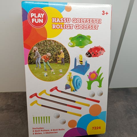 - Värikäs Deluxe golf setti, johon sisältyy kuljetuslaukku, kolme palloa ja kolme erilaista mailaa. Mailat ovat n. 59 cm pitkät.