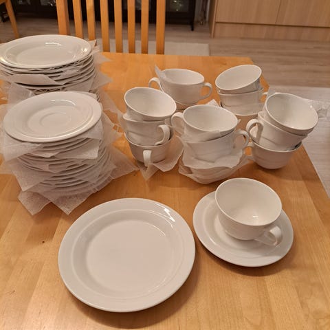 12 kpl kahvikuppi + aluslautanen, 12 kpl leipälautanen, sokerimalja ja kermakko, suola- ja pippurisirottimet, 2 kpl syvää lautasta