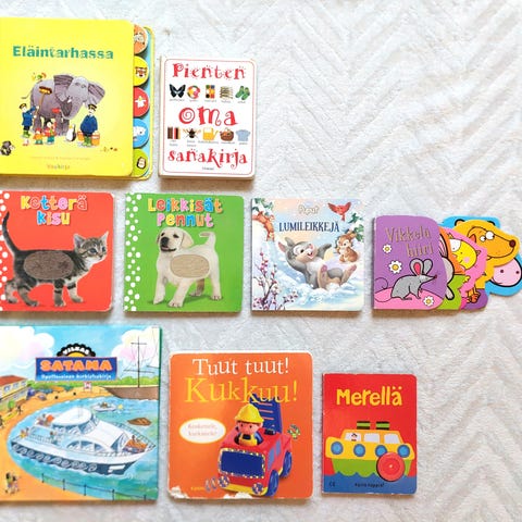 - Taaperon ensimmäinen kissakirja, Ensimmäiset numeroni, Etsi ja yhdistä sanoja -kirja. Kirjat on ostettu lapselle uutena ja ovat vielä siistejä ja suht hyväkuntoisia paitsi Ensimmäiset numeroni -kirja, jossa näkyy eniten käytön jälkiä.