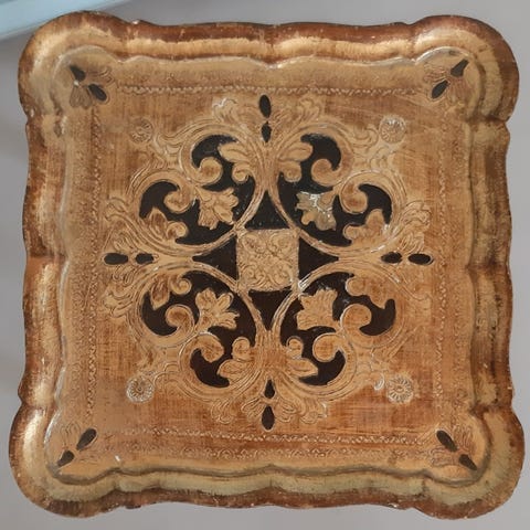 Hieno kevyt siro vintage kahvipöytä display top -lasikannella, jonka alla on mm. kohomallinen kahvikannu, kahvimylly ja kahvikuppi.