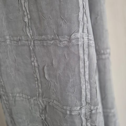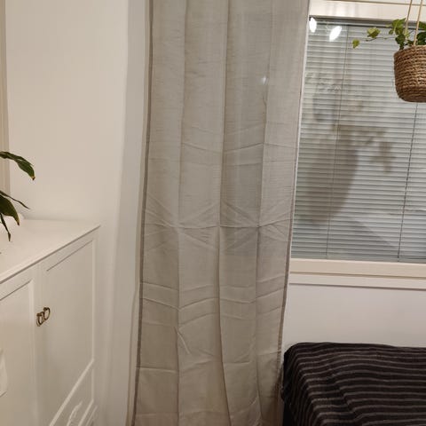 Harmaa verho 148x206. Valmiit ripustuslenkit esim. tankoon. Uskoisin materiaaliksi puuvillan tapaista. Mielestäni ei kertaakaan käytetty, rypyt tulleet säilytyksestä. Aika tumma eli blokkaa valoa.