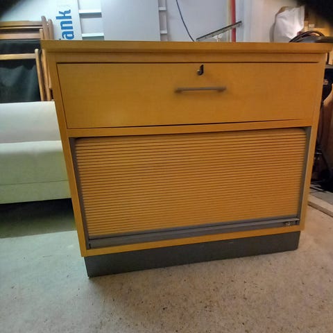 Siistikuntoinen rulo-kaappi. Levy on vedettävissä ulos työtasoksi. Hinta 30 eur