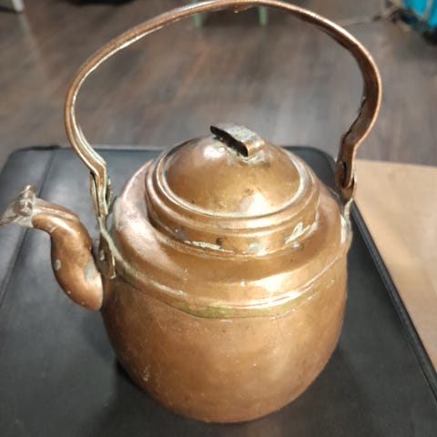 Hyväkuntoinen. Kiillotettu aikanaan - nyt kaunis patina. Tinaus hyvä. Koko 8 - kuvassa vertailun vuoksi 0,33 L oluttölkki. Tekijän leima sangassa. Torakkaläppä paikallaan. Hakasaumat näkyy. Lisää mittoja saa kysymällä.