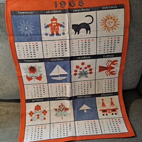 Vuoden 1989 kalenteri. Pyyhkeessä muutama läiskä, mikä ei lähde pesussa