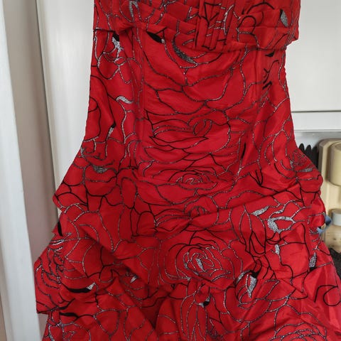 Musta puuvillamekko punaisella ruusukuvioinnilla. Selässä vetoketju, vyötäröllä vyö, taskut.