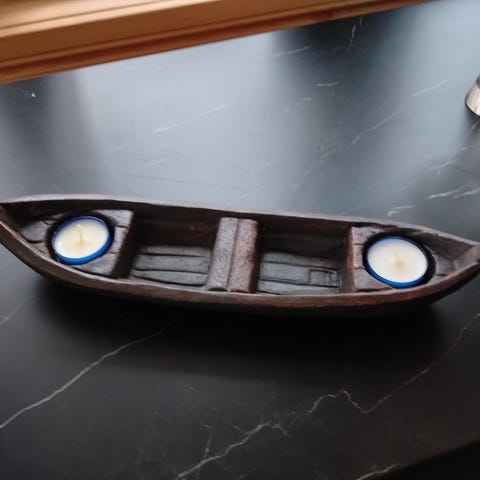 Tämä kaunis sinivalkoinen tuikkuvene on ollut käytössä ja jokunen pieni käytönjälki on mutta hyvässä kunnossa ja siisti tämä on edelleen ja täysin ehjä.