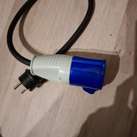 Kolme adapteria. Kaikissa ulostulona CEE pistorasia ja pistotulppana suko pistotulppa tai sitä vastaava. Välikaapeli 3 x 2,5 mm, kumikaapeli. Yksi adapteri on kiintonainen, jossa litteä kolmitappinen pistotlppa ( sveitsi?). Kaksi muuta johdollista varustettu täysin pyöreillä pistotulpilla, toisessa maadoitustappi ja toisessa reikä tappia varten. Vain nouto Kauniaisista.