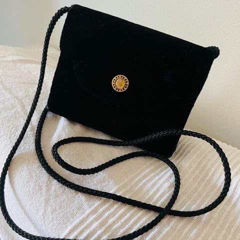 Pieni olkahihnallinen ja kangasvuorellinen musta Morele merkkinen tekonahka laukku. Kolmion mallinen pohjaratkaisu.