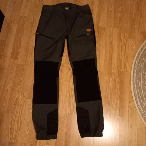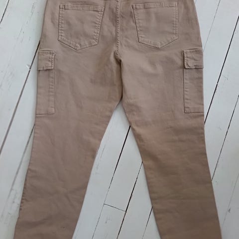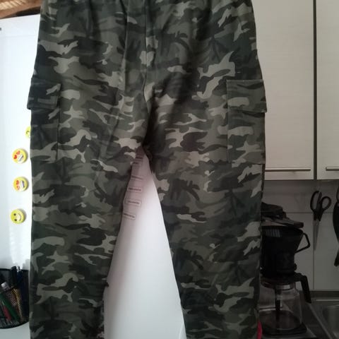 Maastokuvioiset reisitaskuhousut. Lahkeen pituus sisäsaumasta 76 cm, vyötärön leveys n. 40 cm. Vyötäröllä nauhat, joten kiristysmahdollisuus on. Haarasauman korkeus edestä n. 31 cm. Reiden leveys n. 26 cm. Lahkeissa resorit. Lahkeen leveys venyttämättä n. 11 cm. Takataskuista puuttuu napit.