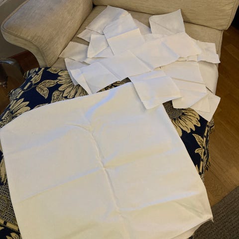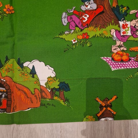 pesin, valkoinen jossa kirkkaan, punahilkan-punaisia pilkkuja. Vahvaa laatua. Ajattelin tilkkutyön taustaksi…. Sopii muuhunkin kuin lakanoiksi…. Hinta 20 ja toimitus.