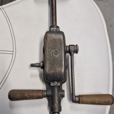Vanha käsin veivattava metallinen pora.