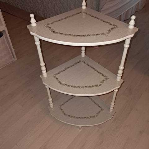 Kevyt, pähkinäpuun sävyinen sivupöytä kahdella pöytätasolla ja eloisalla muotoilulla toimii mainiosti piristävänä sisustuselementtinä. Seinälle kiinnitettynä sitä voi käyttää myös hyllykkönä.