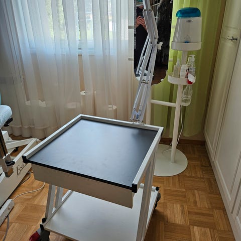 Fysioline 3-tasoinen tarvikevaunu. Sisältää laatikon. Lukittavat pyörät edessä. Kunto: saa hähdä kuvassa. Huom: suurennyslasivalaisin ei kuulu ksuppaan.