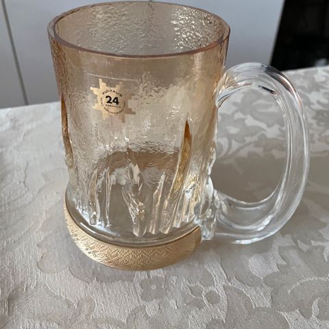 Kotimainen Humppilan valmistama ambran värinen LIEKKI-tuoppi 24 karaatin kullatulla vanteella, ei kaiverrusta vanteessa, korkeus 15 cm, halkaisija 11 cm, harvinainen, 70-luvulta mutta käyttämätön, signeerattu E.Vänni Humppila Finland,