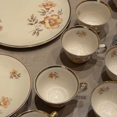Kaikissa astioissa Arabian piippuleima. Yksi kuppi rikkoutunut. Muuten hieno, käytetty ja hyväkuntoinen astiasto. Lautasten ja kuppien pohjasta piippuleima on kulunut, muissa näkyy selkeästi.