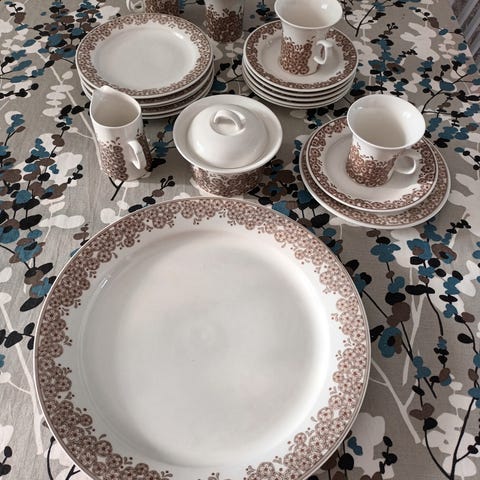 Venäläinen Gzhel -keramiikka-astiasto; 6 pientä kahvikuppia ja 5 lautasta (yksi puuttuu), kahvikannu ja sokerikko. Hp.60 e.
