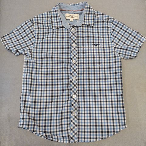 Myydään H&M lyhythihainen kauluspaita koossa 134. Vaaleansinisellä pohjalla tummia pisteitä. 100% puuvillaa. Kaikki napit tallella.
