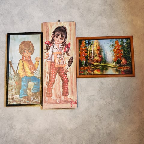 Kaksi pyöreää käsinmaalattua taulua, jossa on kaksi erilaista kuva-aihetta: maisema ja kukkakimppu. Taulun värit ovat moniväriset, ja se sopii sisustukseen koriste-esineeksi.