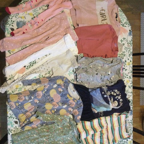 Kesäinen vaatesetti. Lähinnä H&M vaatteita, muutama muun merkin, kokoa 92cm. Ruskeassa t-paidassa nukkaantumista, muut kunnossa.