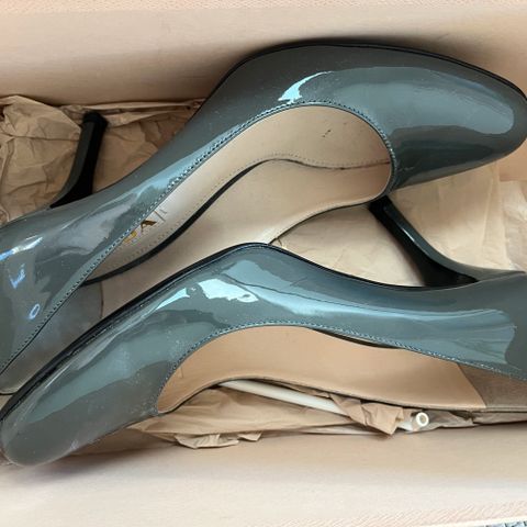 Upeat hopeanväriset italialaisen luksus merkin Pradan nahkakorkokengät. OVH noin 1.000euroa. Peep toe malli, jossa varpaat pilkottavat hieman. Koron korkeus 14cm ja kiilan korkeus 4cm eli tuntuvat jaloissa 10cm korkealta. Hyvät ja tukevat jalkaan korkeudesta riippumatta. Ovat olleet jalassa yksissä juhlissa. Muutama pieni naarmu koroissa, kärjissä ja kantapäässä.