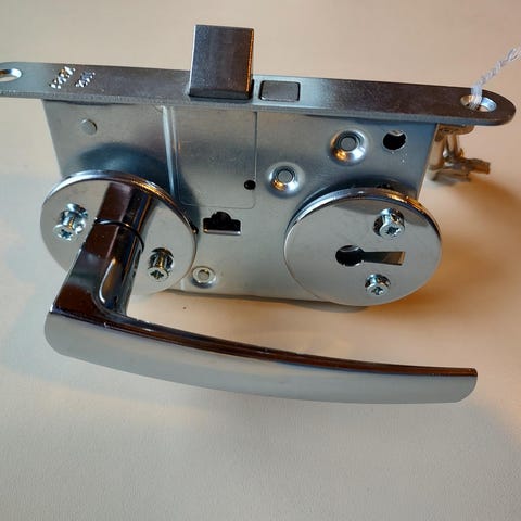 Välioven kaunis ja ajattoman tyylikäs painike harjatusta ruostumattomasta teräksestä. Painikkeen kilpi ja avainkilpi piilokiinnityksellä. Kahvan halkaisija 19 mm. Sopii 36-65 mm oviin. Myyntipakkauksessaan avaamattomana. hinta 20e.