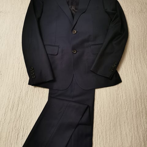 Sopinee hoikalle 175-177cm pitkälle nuorelle. 46 puvuntakki otettu ilmeisesti pikkuisen sisään, enemmänkin slim fit. Housujen lappu sanoo 31/32, mutta toisiin saman kokoisiin housuihin verrattuna sanoisin 30/32.