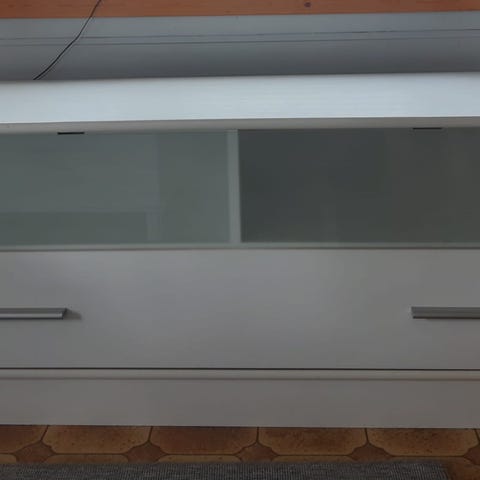 Valkoinen, lasinen hylly.