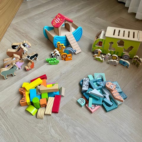Kahden puisen lelun yhteishinta 8 eur. Eläinjuna on koottava (7 osaa)