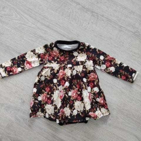 Myydään juhlissa käytetty bodymekko kukkakuosilla. Takana nepparit. Mekko on peräisin Australiasta. Kokolapun mukaan käy 1-vuotiaalle, meillä oli käytössä 80cm kokoisella. Mukaan myös samaa kuosia oleva pääpanta.