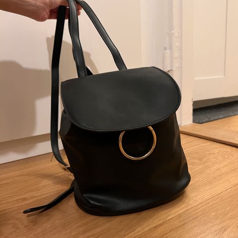 Mustavalkoinen kangasreppu tekonahkaisilla yksityiskohdilla. Edessä kaksi magneettikiinnitteistä taskuja, sisäpuolella pieni vetoketjutasku. Kiristysnyöreissä pintamateriaali kulunut, mutta ei haittaa käyttöä. Mitat n. 35x32x14 cm.