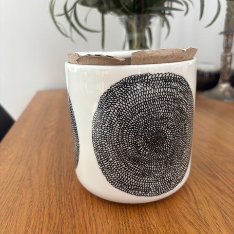 Purkin koko 15,5 x 16,5 cm. Tumman sininen kansi.