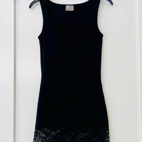 Superdry maximekko. Alla musta trikoomekko ja päällä neulottu pitsikuvio mekko. Joutava