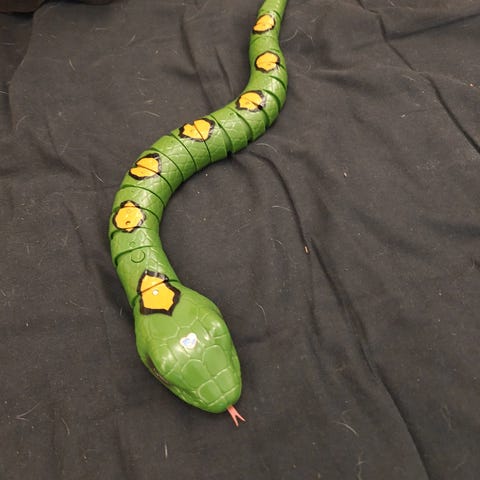 Myydään todella hyvässä kunnossa interaktiivinen käärme paristoilla. Tämä robottikäärme liikkuu melkein kuin oikea käärme. Silmät näyttävät realistisilta ja siinä on kieli, joka lepattaa. Toimii ja liikkuu.