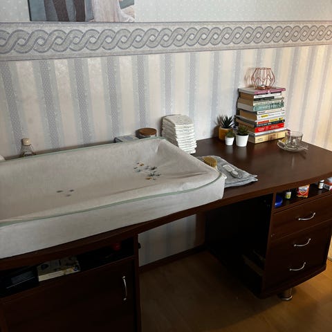 Jykeväkantinen metallirunkoinen työpöytä. Valmistettu aikoinaan amiksessa ompeluosaston työpöydäksi.