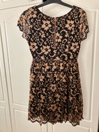 Myyn Elloksen mekon, jonka koko on 34. Mekon päällikankaassa on kultainen kukkakuosi ja vuori on yksiväristä mustaa kangasta.