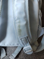 Käytetty sininen reppu. Kankaassa parissa kohtaa hieman likaa, mikä kyllä pestessä lähtee pois. Reppu on aikaisemmin pesty kerran käsin, joten materiaali on pestävää.
