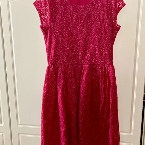 Mekon päällikangas on 95 % polyesteriä, 3 % metallikuitua ja 2 % polyesteriä, vuori on 100 % puuvillaa. Mekko on käytetty, mutta uudenveroisessa kunnossa.
