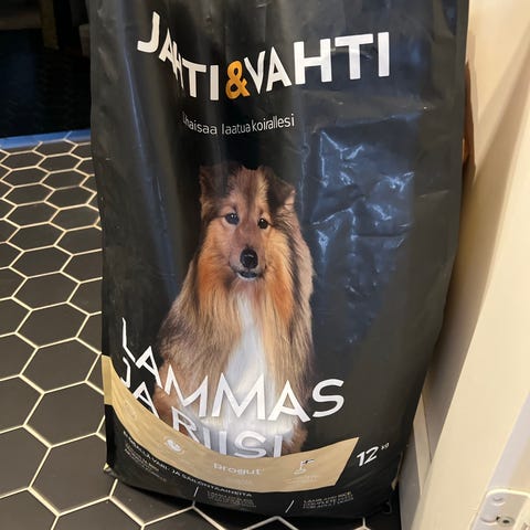 Kaksi isoa säkkiä koiranruokaa, päiväystä jäljellä vielä reilu vuosi, toiseen säkkiin kissani tehnyt reikiä ja ehkä syönyt pari nappulaa, reiät teipattu kiinni.