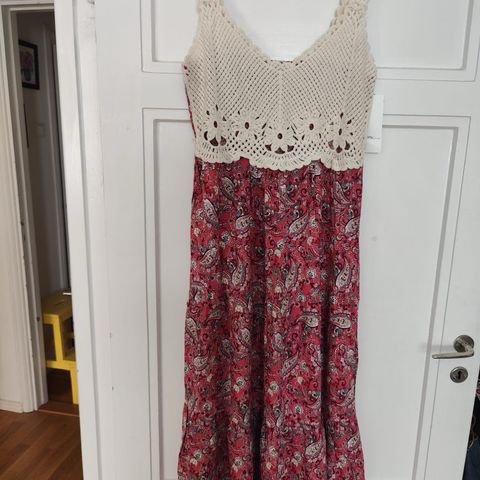 Muutaman kerran käytetty pitkä hellemekko paisley-kuvioilla. Kevyttä, siliävää kangasta (viskoosia ja puuvillaa).
