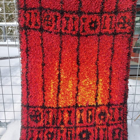 Pirkka -ryijy. Suunnittelija Laila Mikkonen. Koin ja valonkestävä Lanka. 100% villa.