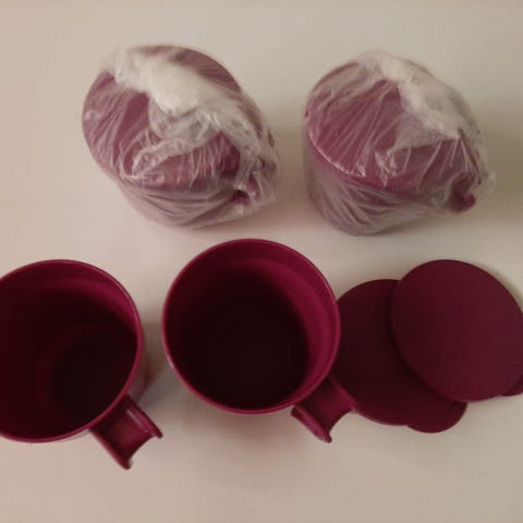 Violetit Tupperware Aloha 4 kpl:tta. Mukit 3,5 dl. Käyttämättömät. Säilytyksessä tullut yhden mukin kanteen haalea pieni naarmu. Nouto tai postikulut ostajalle